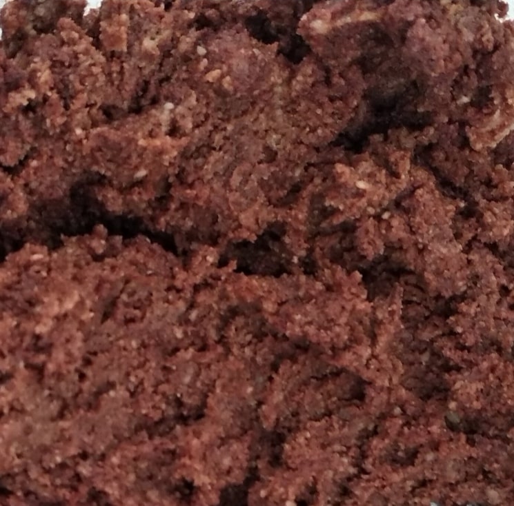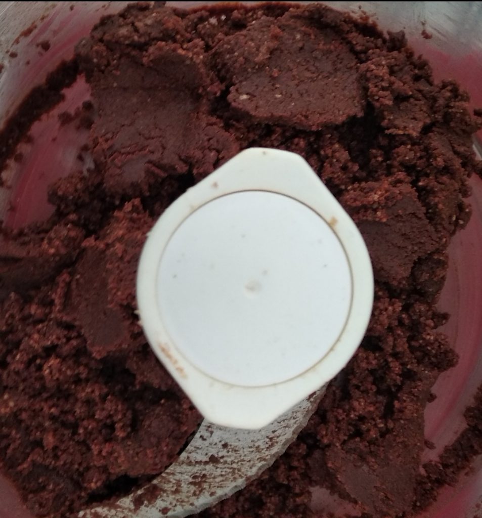 - לתערובת האגוזים שנותרה, אני מוסיפה כ-10 מטבעות עיסת קקאו. העיסה מזרזת את הפיכת האגוזים לחמאה ונותנת לחלווה טעם שוקולדי מדהים. אפשר להמיר בקקאו נא או לוותר. חמאת קקאו מתקבלת כעבור 2-3 דק' טחינה ואותה נוסיף לקערה עם הטחינה והאגוזים הטחונים.