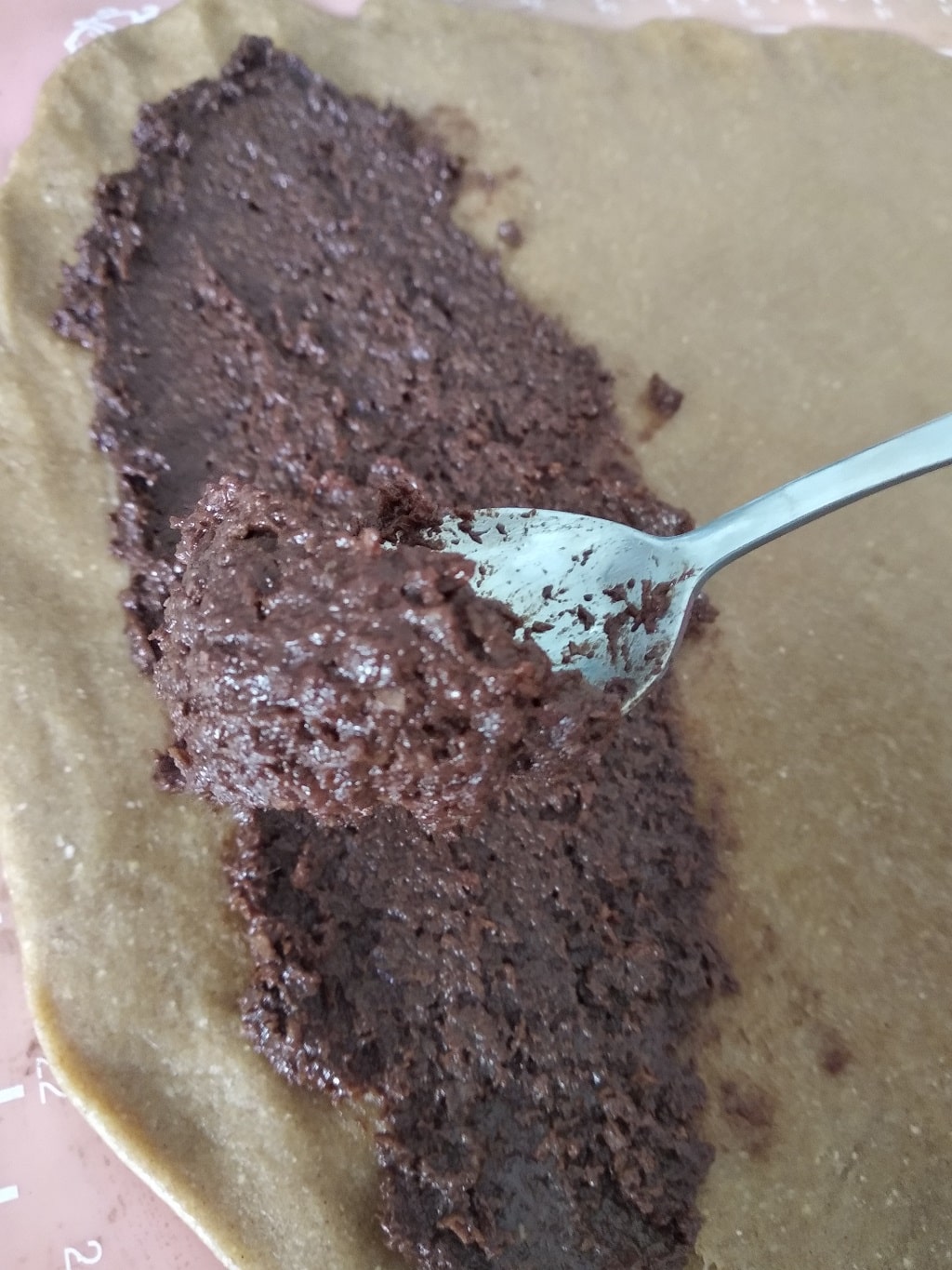 - ניקח שוקולד ונמרח על חלק אחד של העלה. (מי שמשתמשת בממרח קנוי רגיל (חבלללל) אפשר למרוח אותו)