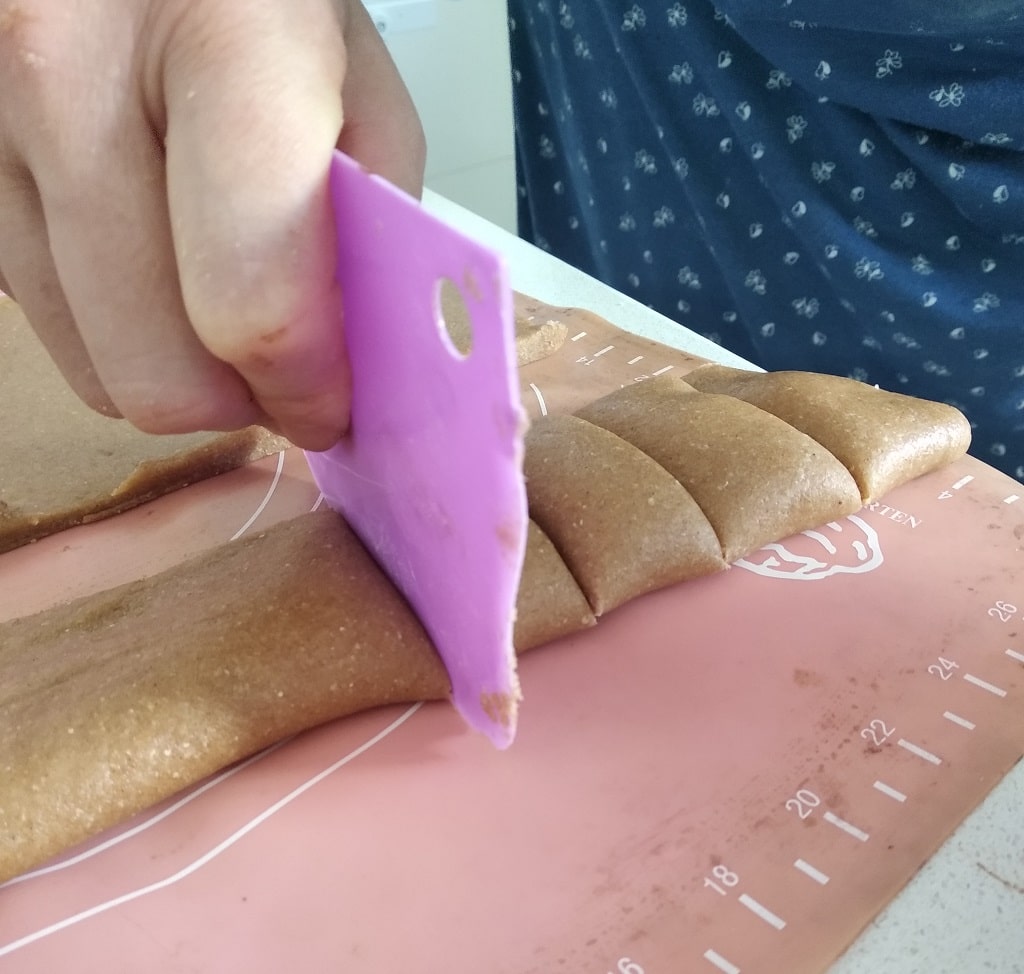 - בעזרת קלף/סכין , נחתוך בעדינות פרוסות בעובי 2 אצבעות או בגודל הרצוי. אפשר עם מזלג ללחוץ מעט על החלק העליון ליצור קישוט מעל כל עוגייה.