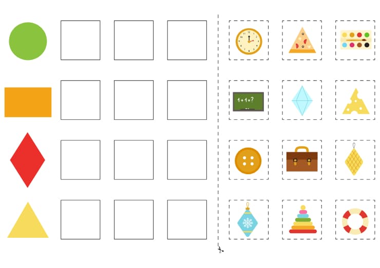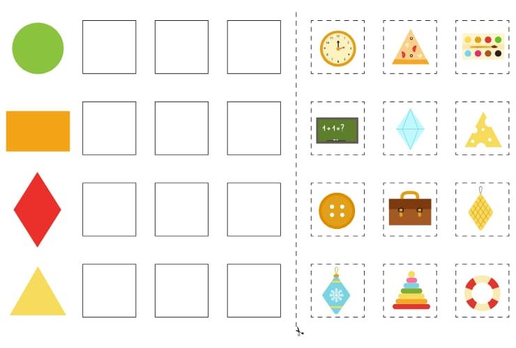 בדף הזה, על הילדים לגזור את הציורים על הקווקווים ולהדביק אותם במקום המתאים על פי הצורה. לדוגמא: את השעון יש להדביק במשבצת שבשורה עם העיגול הירוק.