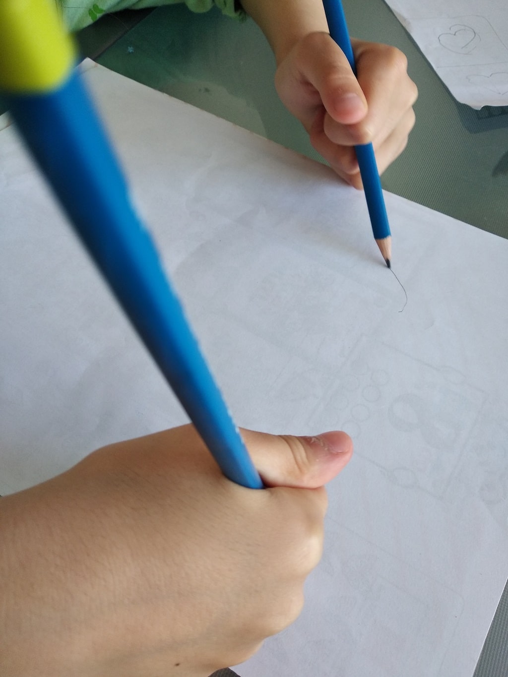 - לוקחים את הדף שבחרנו, ועיפרון בכל יד (אפשר גם כל כלי צביעה/כתיבה אחר).