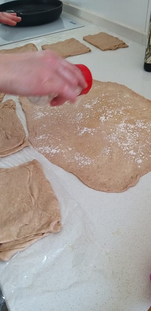 - נפעל שוב כמו בסעיפים 6 ו 7 : נמרח מעט שמן על כל המלבן, נפזר קמח ונקפל למרכז. נקבל בצק בצורת ריבוע מחולק לעלים.
