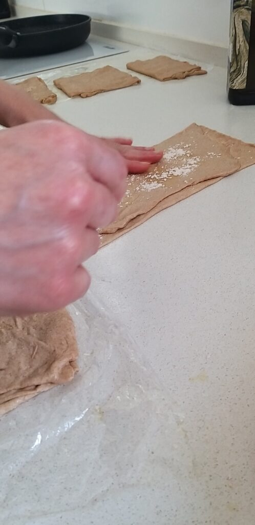 - ניקח את הריבוע הראשון שיצרנו, נניח על השיש המשומן נשטח ונרדד קלות.
