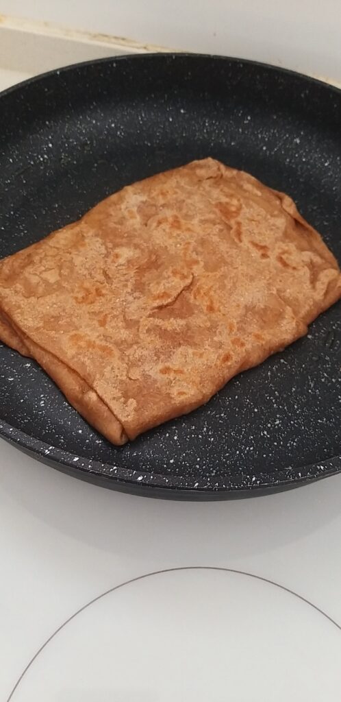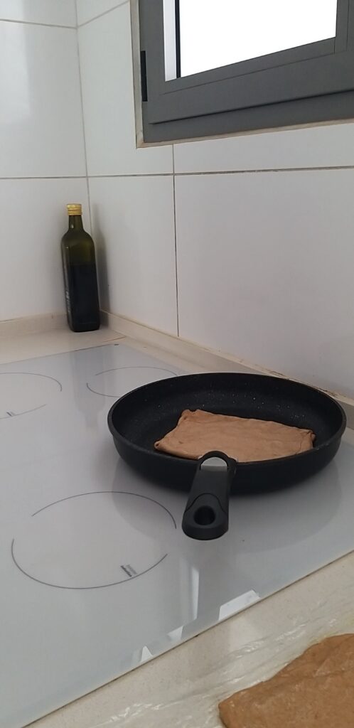 - מיד לאחר מכן, נעביר את אותו הריבוע = הקאהי שלנו – למחבת החמה ונתחיל לטגן. יש להפוך מדי פעם עד ששני הצדדים מיטגנים ומשנים את צבעם.