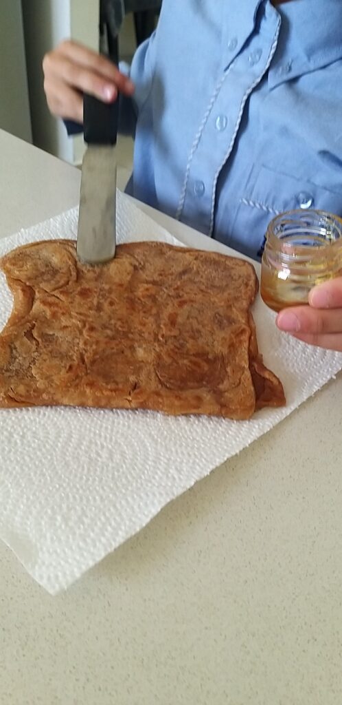 - מי שבכל זאת תרצה להשתמש בחמאה/מרגרינה צריך למרוח שכבה של חמאה/מרגרינה ליצירת העלים. ולכן במקום למרוח שמן ולפזר קמח תפזרו שכבה דקיקה של חמאה/מרגרינה במקום. תקפלו שוב תמרחו ושוב תקפלו… במצב הזה החמאה/מרגרינה הרבה יותר שומניות ואין צורך לשמן את המחבת. ברגע שתניחו השומן שלהן יימס במחבת.
