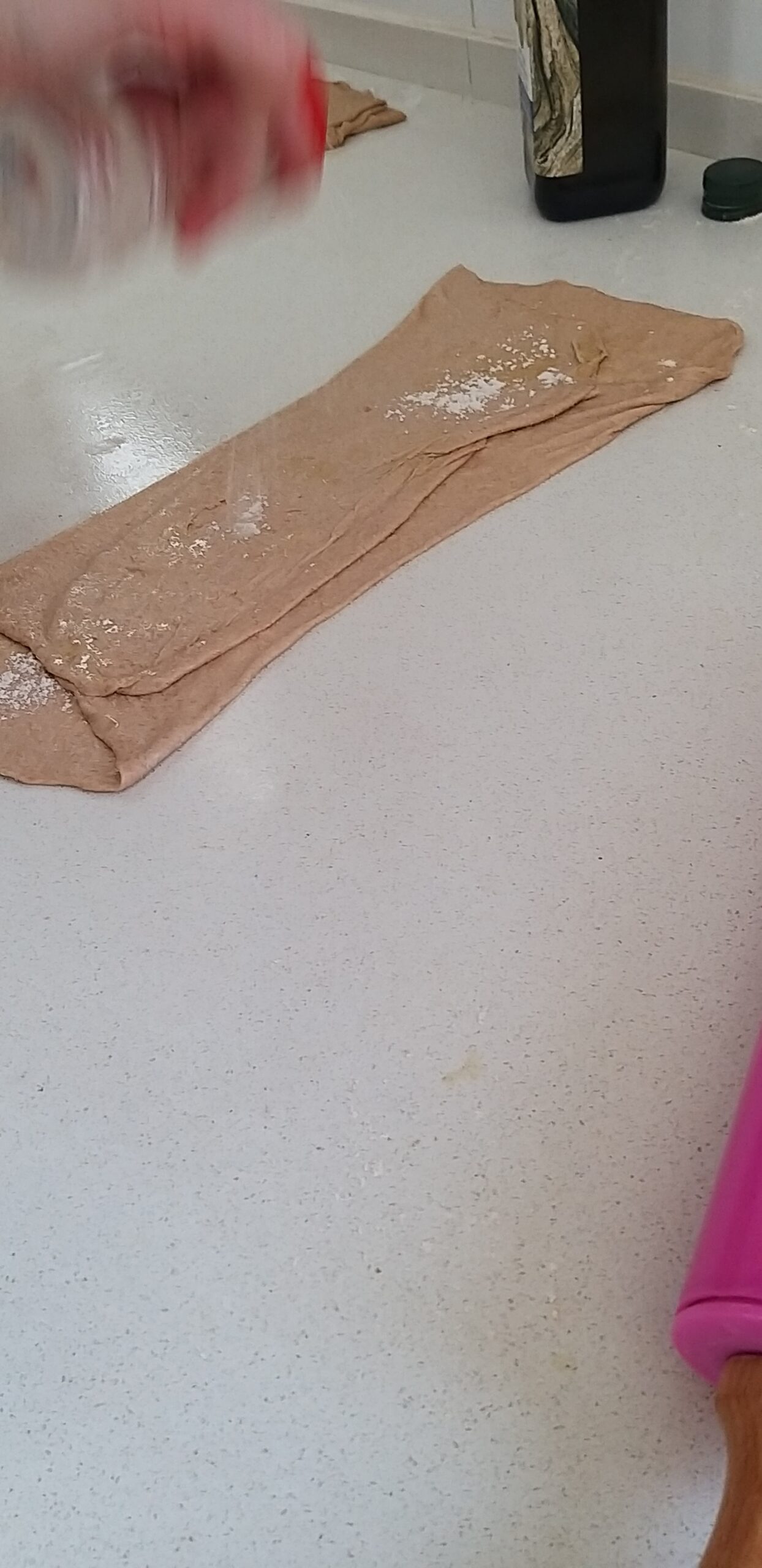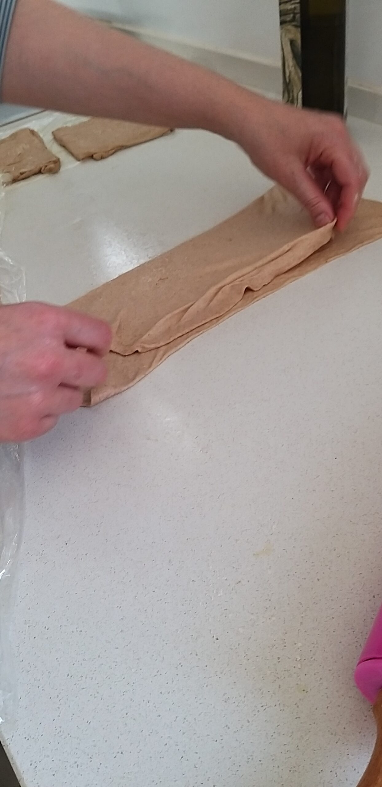 - נקפל צד אחד של הבצק לאמצע ואת הצד השני נקפל מעליו. נקבל בצק בצורה מלבנית ארוכה.