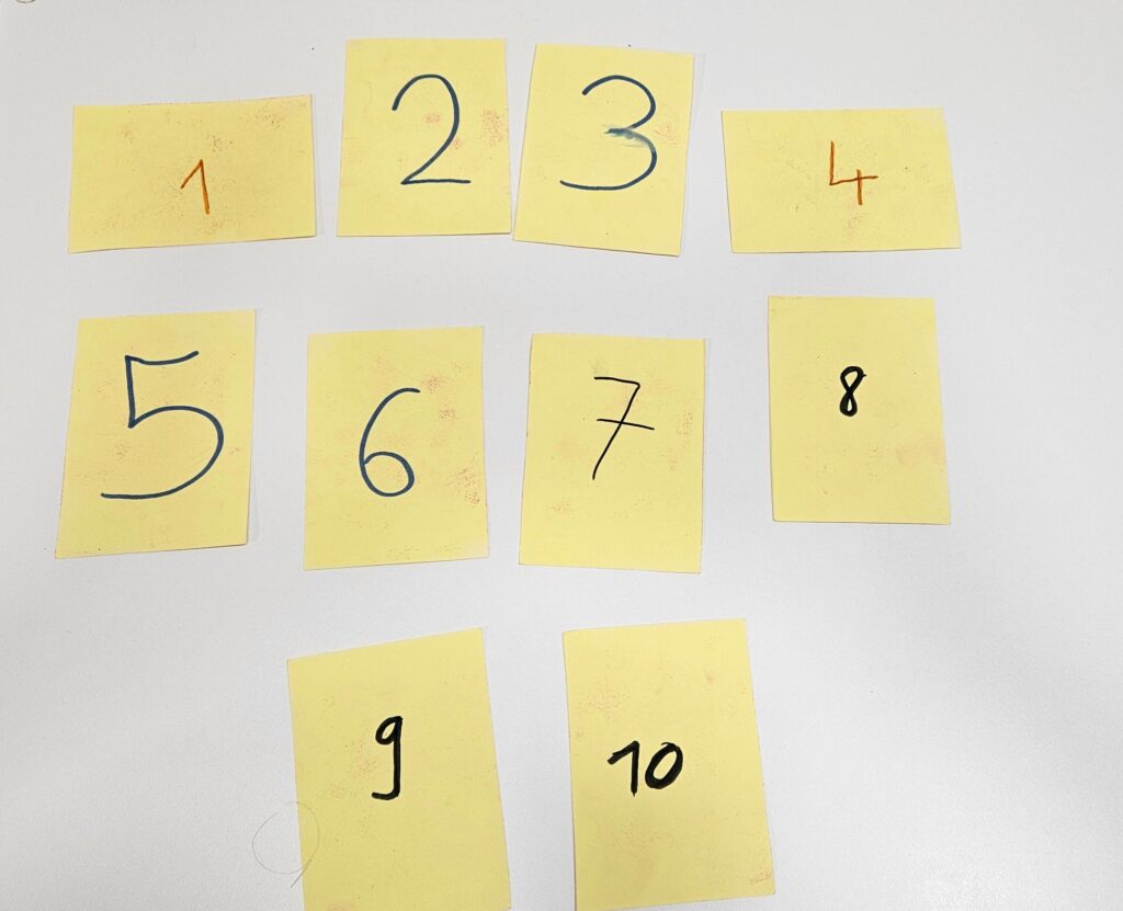 - חשבנו על רעיון והחלטנו על רצף מסוים לפיו נדע כמה כרטיסים להכין. אני הכנתי מספרים מ 1- 10 זאת אומרת שהכנו 10 כרטיסים.