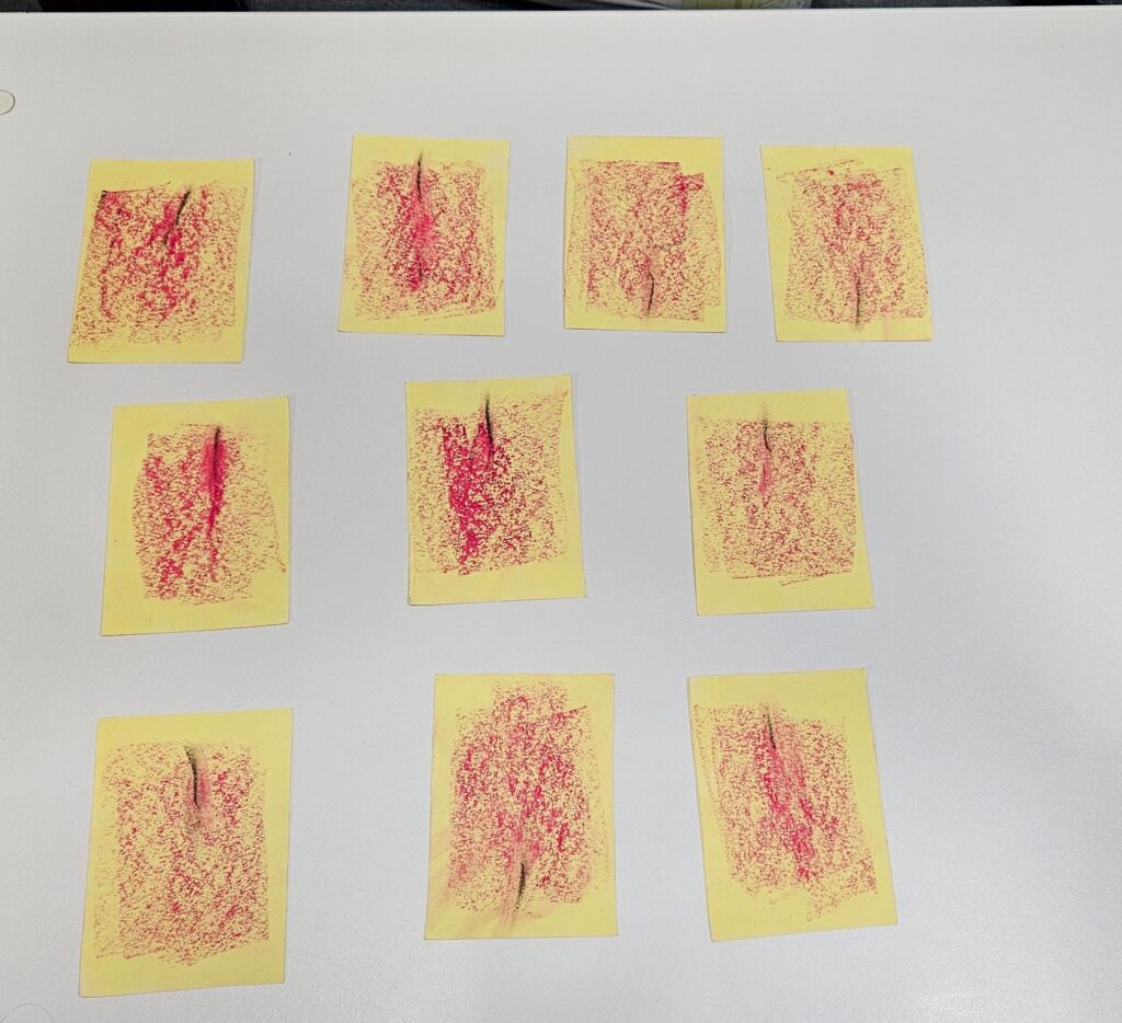 אני לקחתי שמינית בריסטול ועוד 2/8 משמינית בריסטול, חלקתי את השמינית לשמונה חלקים שווים, גזרתי והכנתי עוד 2 כרטיסים זהים משמינית בריסטול נוספת. - לאחר שגזרנו את הכרטיסים כותבים על כל כרטיס את מה שבחרנו כרצף למשל ספרה או אות וכו'.