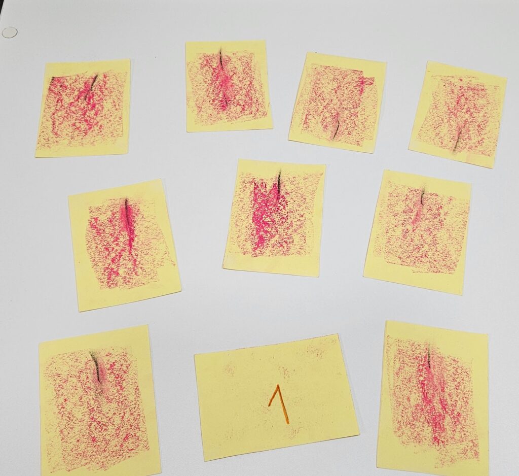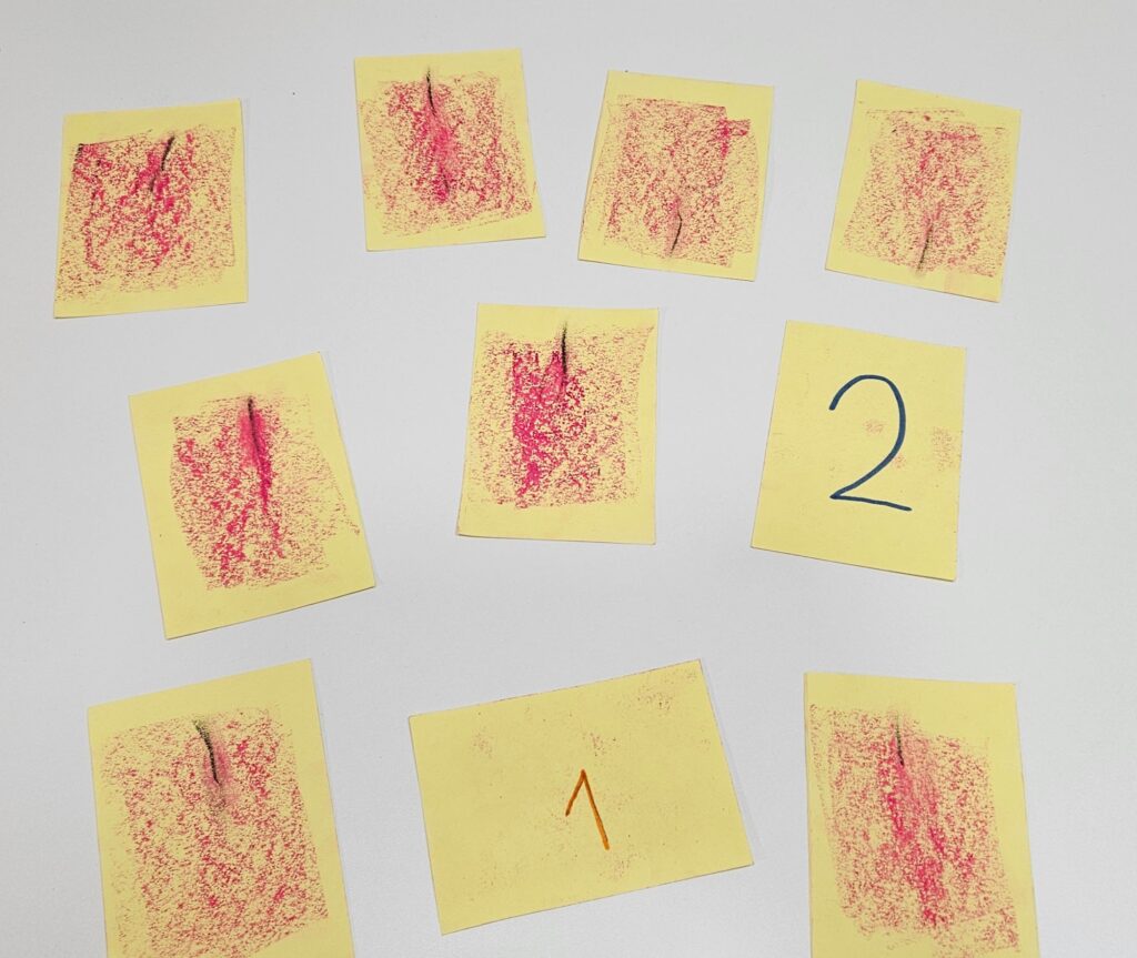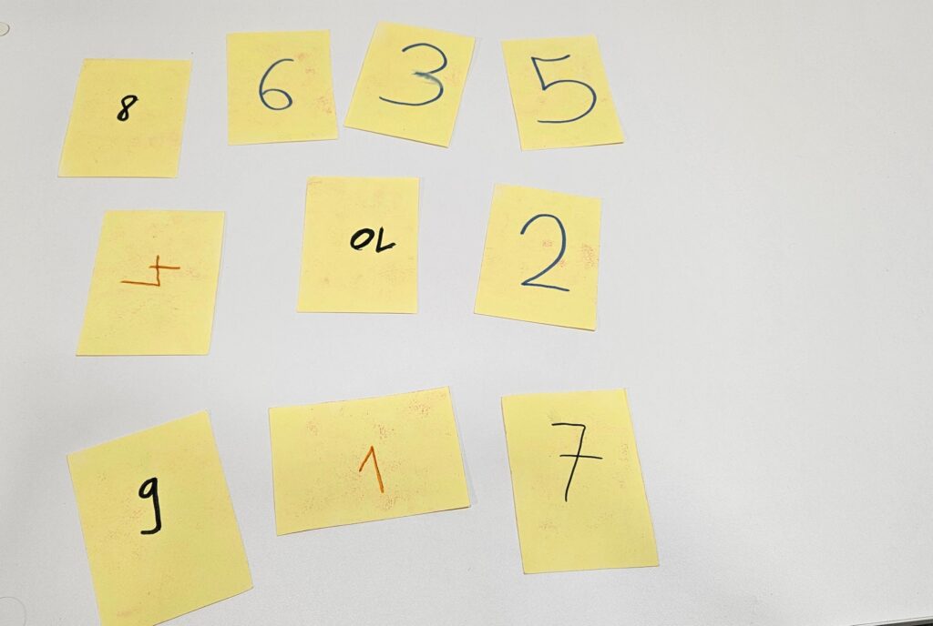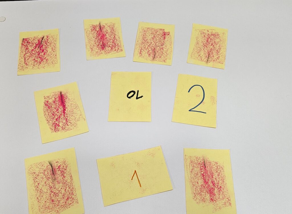 אני חלקתי בין הילדים שלי שכתבו את הספרות הרלוונטיות בהתאם לחלוקה שנתתי להם. - אם גב הכרטיס שקוף ואפשר לראות את הגב בצד הפנימי, אפשר ומומלץ לטשטש זאת על ידי צביעה/קישוט של גב הכרטיס. כמובן גם כאן מאחר שמדובר במשחק זיכרון, הקישוטים וצורת הצביעה צריכים להיות זהים שלא נוכל להבדיל ולזהות מראש מה מסתתר….