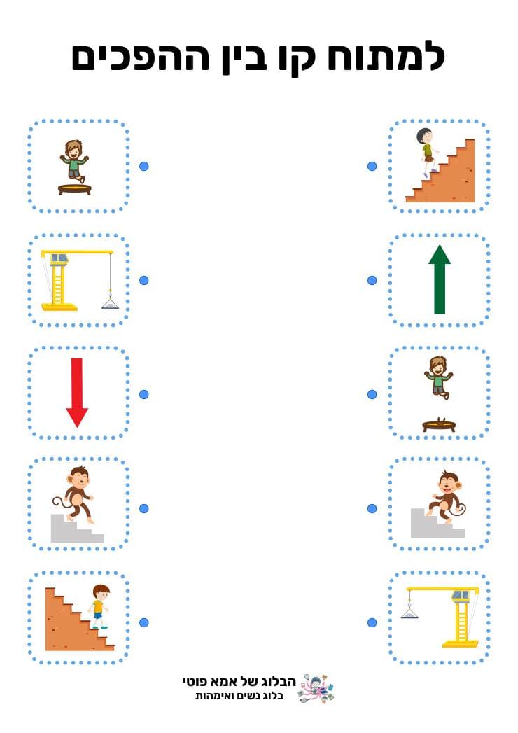 זמן קריאה: < 1 דקותתרגיל להדפסה בנושא כיוונים הפוכים: עליה וירידה. דף עבודה בנושא ירידה עליה דף עבודה להדפסה לילדים בגיל הרך בנושא הפכים כיוונים: ירידה – למעלה. בהצלחה! להורדת דף עבודה מציאת הפכים 8 להורדת דף עבודה מציאת הפכים 8