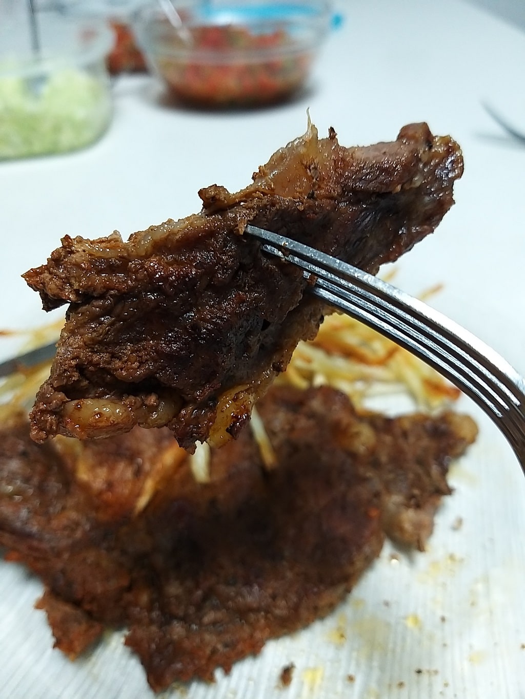 - ממשיכים לצרוב את הסטייקים בלי מכסה ומדי פעם הופכים אותם עד שרואים שהם משחימים (לא שרופים) ונחתכים בקלות. זה לוקח בערך עוד חצי שעה על עוצמת חום בינונית ולא עוצמה גבוהה.