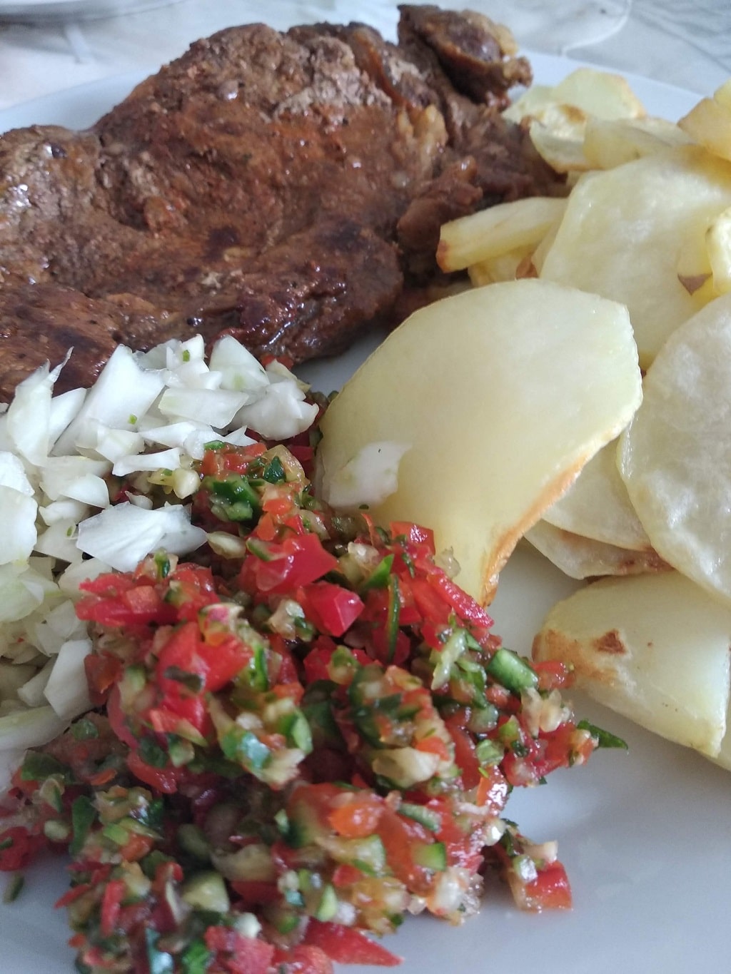 מתכון פשוט שאינו דורש כלים ומצרכים רבים וטוב יותר מ"על האש" מבחינה בריאותית… עליכן לבקש מהקצב פרוסות סטייק אנטריקוט בעובי דק-בינוני, ללא עצם. מוסיפים תבלינים, מניחים את הסטייק במחבת/פלנצ'ה ואפשר גם בתנור ולאחר צלייה טובה משני צדדים זה מוכן…