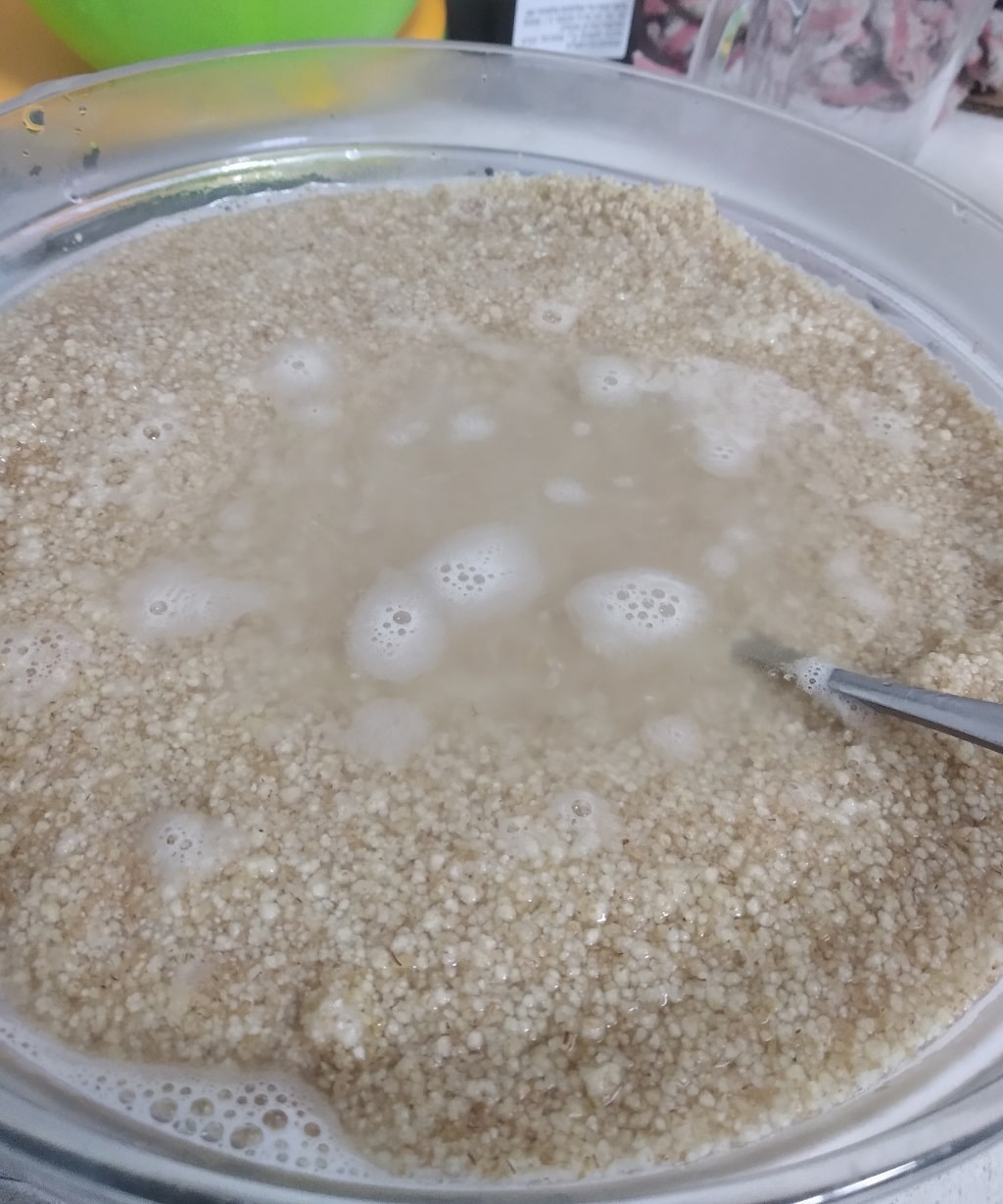 - כעת, שופכים שתי כוסות מים רותחים מכסים את הקערה וממתינים 5-6 דק'.