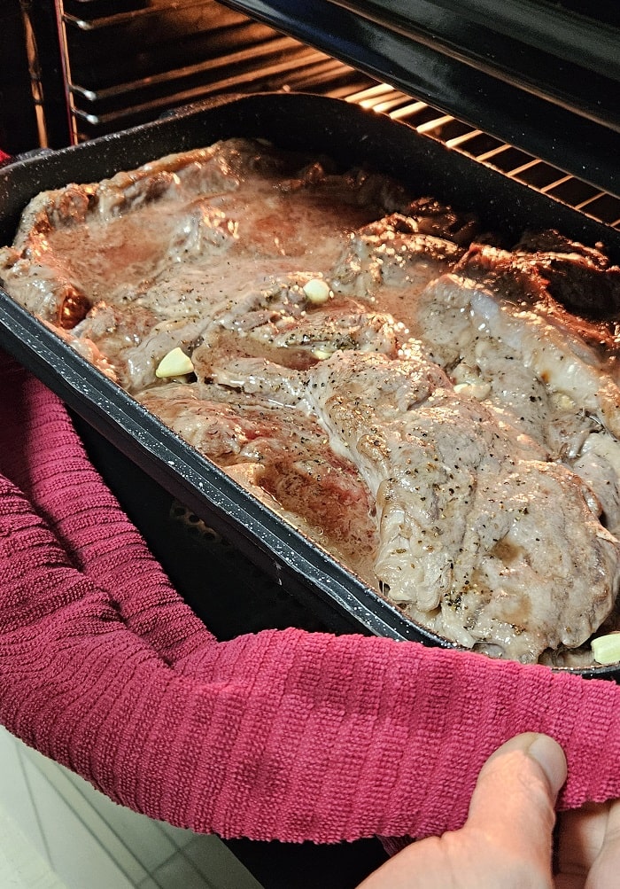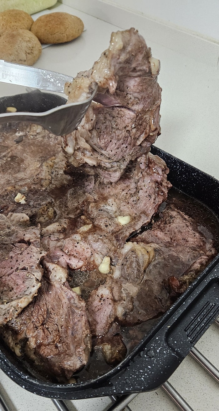 - מכניסים את הסטייקים לתנור עם מכסה סגור למשך חצי שעה.