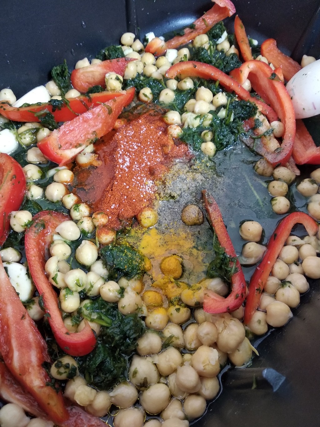 - כעת הוסיפו תבלינים, 4-5 כפות שמן זית וכוס מים.
